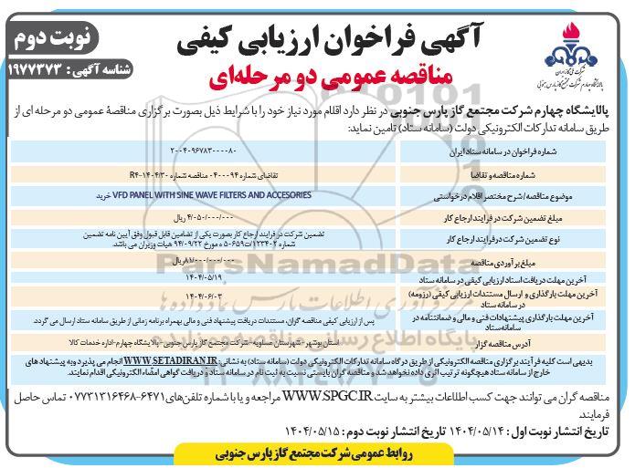مناقصه خرید VFD PANEL WITH SINE WAVE FILTERS AND ACCESORIES نوبت دوم از کلیه افراد متخصص و شرکتها واجد شرایط دعوت به عمل میآید در مناقصه با کد خبرگزاری پارس نماد: 9376718 شرکت نمایند.