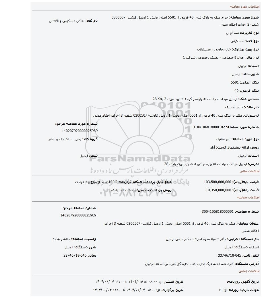 عنوان معامله: ملک به پلاک ثبتی 40 فرعی از 5501 اصلی بخش 1 اردبیل کلاسه 0300507 شعبه 3 اجرای احکام مدنی