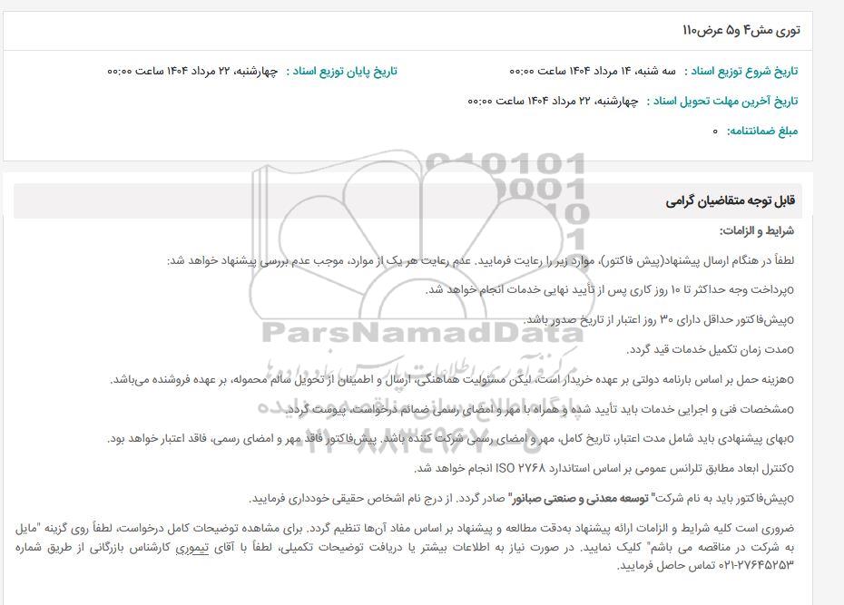ضروری است کلیه شرایط و الزامات ارائه پیشنهاد به دقت مطالعه و پیشنهاد بر اساس مفاد آنها تنظیم گردد. برای مشاهده توضیحات کامل درخواست لطفا روی گزینه مایل به شرکت در مناقصه میباشم کلیک نمایید در صورت نیاز به اطلاعات بیشتر یا دریافت توضیحات تکمیلی لطفاً با آقای تیموری کارشناس بازرگانی از طریق شماره 021 -27645253 تماس حاصل فرمایید.