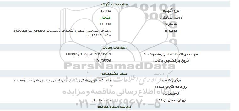مناقصه راهبری، سرویس، تعمیر و نگهداری تاسیسات مجموعه ساختمان های بیمارستان مهریز از کلیه افراد متخصص و شرکتها واجد شرایط دعوت به عمل میآید در مناقصه با کد خبرگزاری پارس نماد: 9377040 شرکت نمایند.