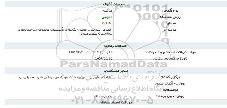 مناقصه راهبری، سرویس، تعمیر و نگهداری تاسیسات مجموعه ساختمان های بیمارستان مهریز از کلیه افراد متخصص و شرکتها واجد شرایط دعوت به عمل میآید در مناقصه با کد خبرگزاری پارس نماد: 9377049 شرکت نمایند.