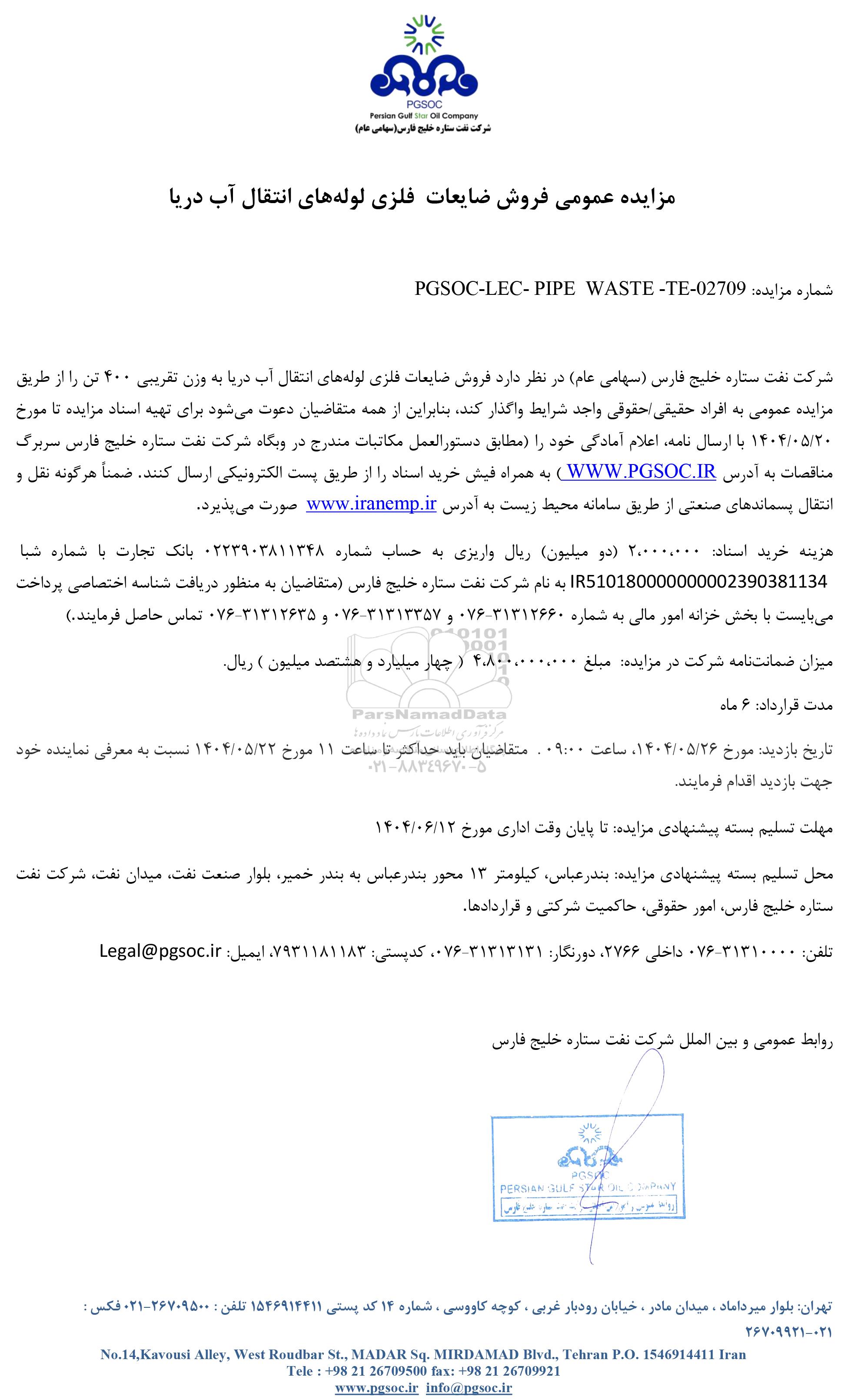 شرکت نفت ستاره خلیج فارس (سهامی عام) در نظر دارد فروش ضایعات فلزی لوله های انتقال آب دریا به وزن تقریبی 400 تن را از طریق مزایده عمومی به افراد حقیقی/حقوقی واجد شرایط واگذار کند، بنابراین از همه متقاضیان دعوت میشود برای تهیه اسناد مزایده تا مورخ 1404.05.20 با ارسال نامه، اعلام آمادگی خود را (مطابق دستورالعمل مکاتبات مندرج در وبگاه شرکت نفت ستاره خلیج فارس سربرگ مناقصات به آدرس WWW.PGSOC.IR ) به همراه فیش خرید اسناد را از طریق پست الکترونیکی ارسال کنند. ضمناً هرگونه نقل و انتقال پسماندهای صنعتی از طریق سامانه محیط زیست به آدرس www.iranemp.ir صورت میپذیرد.