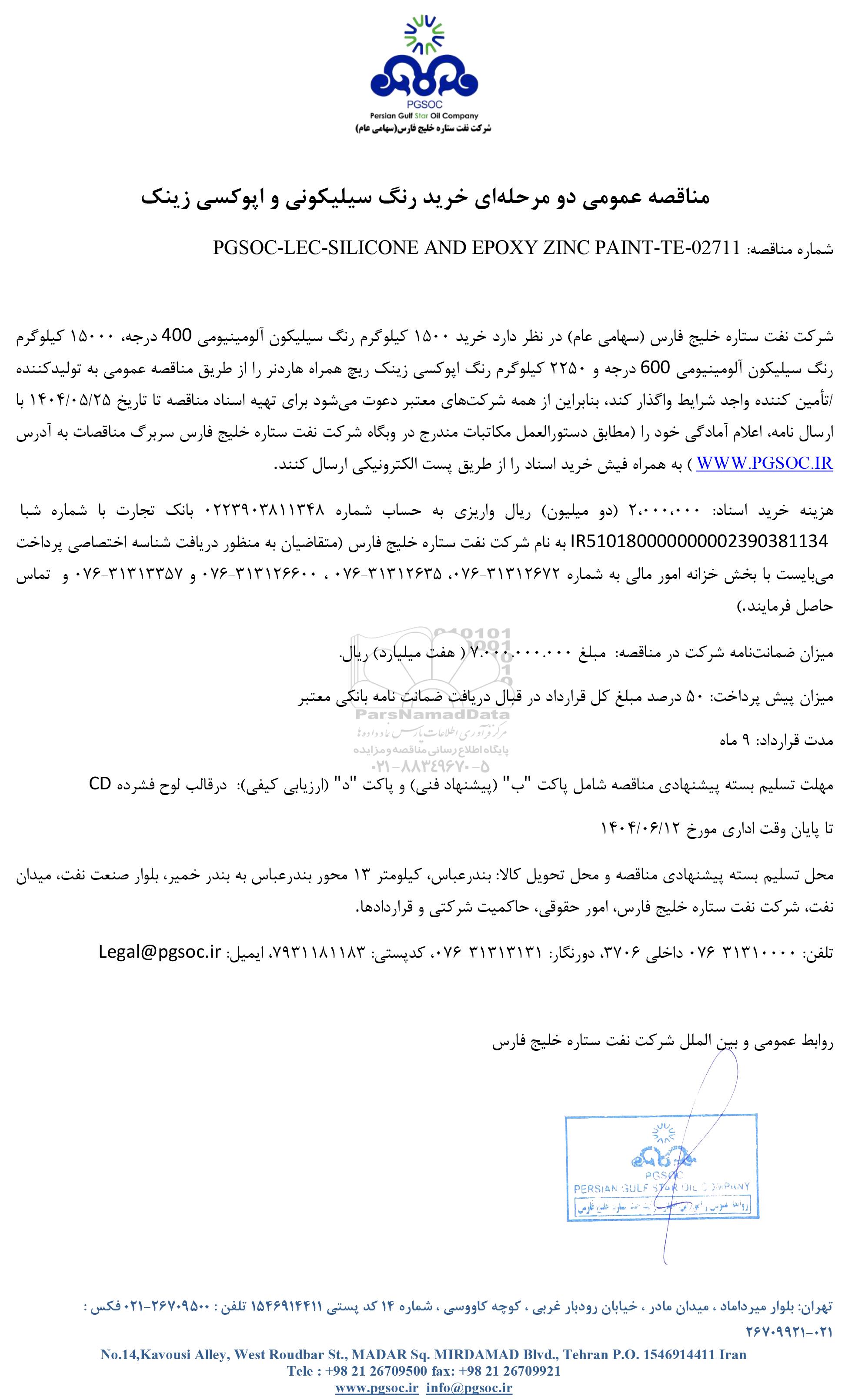 شماره مناقصه: PGSOC-LEC-SILICONE AND EPOXY ZINC PAINT-TE-02711