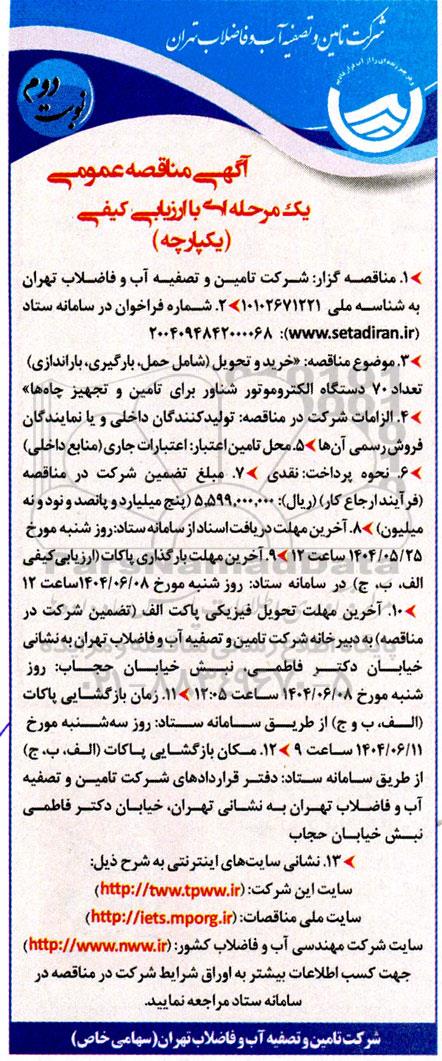 3- موضوع مناقصه: خرید و تحویل (شامل حمل، بارگیری، باراندازی) تعداد 70 دستگاه الکتروموتور شناور برای تامین و تجهیز چاه ها»
