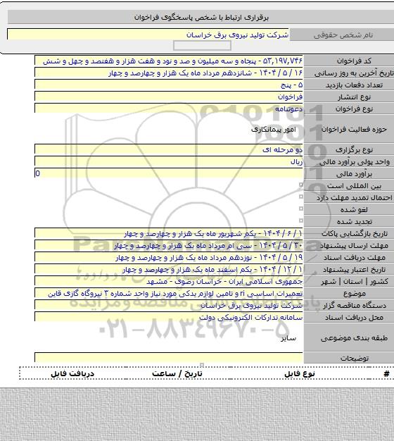 مناقصه تعمیرات اساسی ri و تامین لوازم یدکی مورد نیاز واحد شماره ۳ نیروگاه گازی قاین از کلیه افراد متخصص و شرکتها واجد شرایط دعوت به عمل میآید در مناقصه با کد خبرگزاری پارس نماد: 9378036 شرکت نمایند.