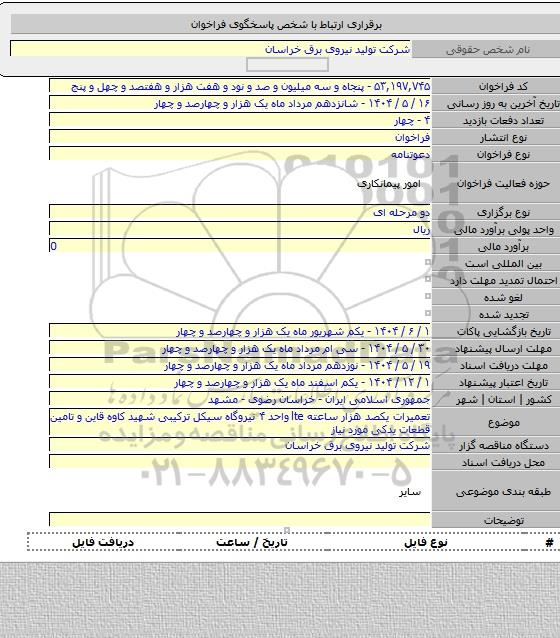 علاقهمندان میتوانند جهت دریافت اسناد و اطلاعات تکمیلی، مناقصه تعمیرات یکصد هزار ساعته lte واحد ۴ نیروگاه سیکل ترکیبی شهید کاوه قاین و تامین قطعات یدکی مورد نیاز با سامانه مناقصات و مزایدات ایران پارسنماد داده ها 88349670 تماس حاصل نمایند.