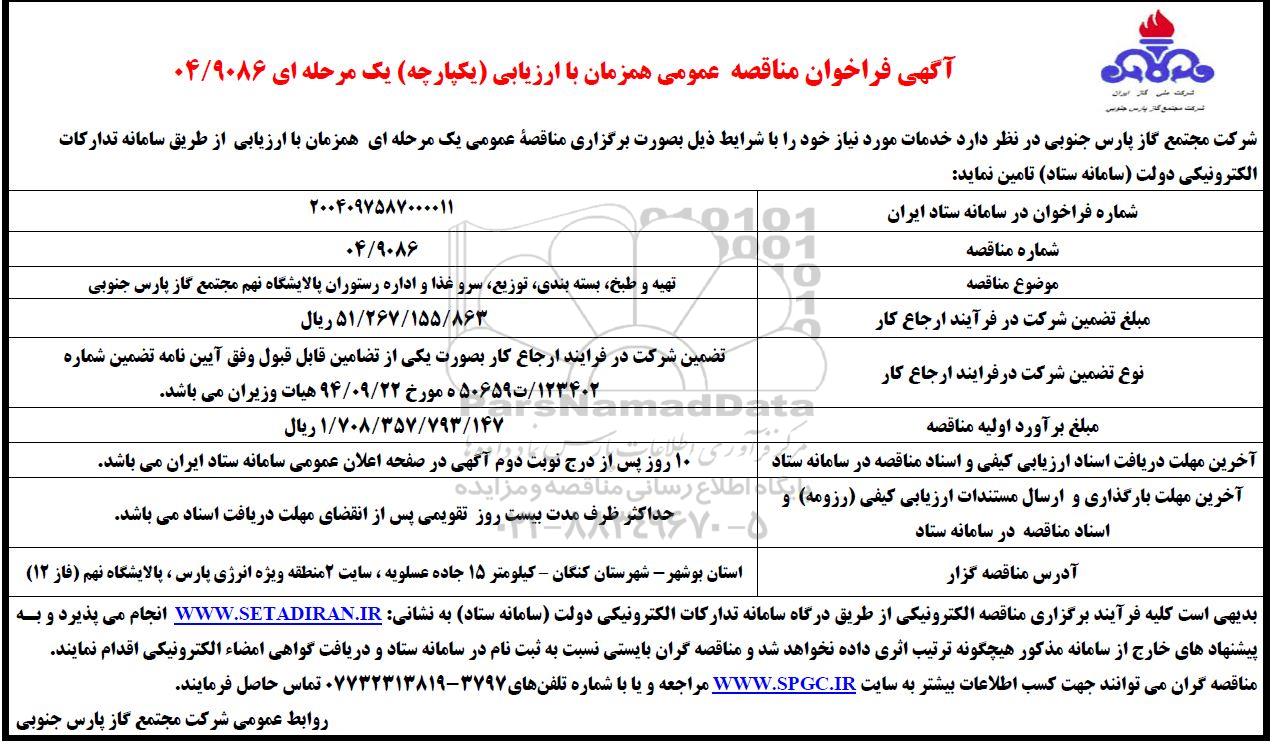 موضوع مناقصه: تهیه و طبخ، بسته بندی، توزیع، سرو غذا و اداره رستوران پالایشگاه نهم مجتمع گاز پارس جنوبی