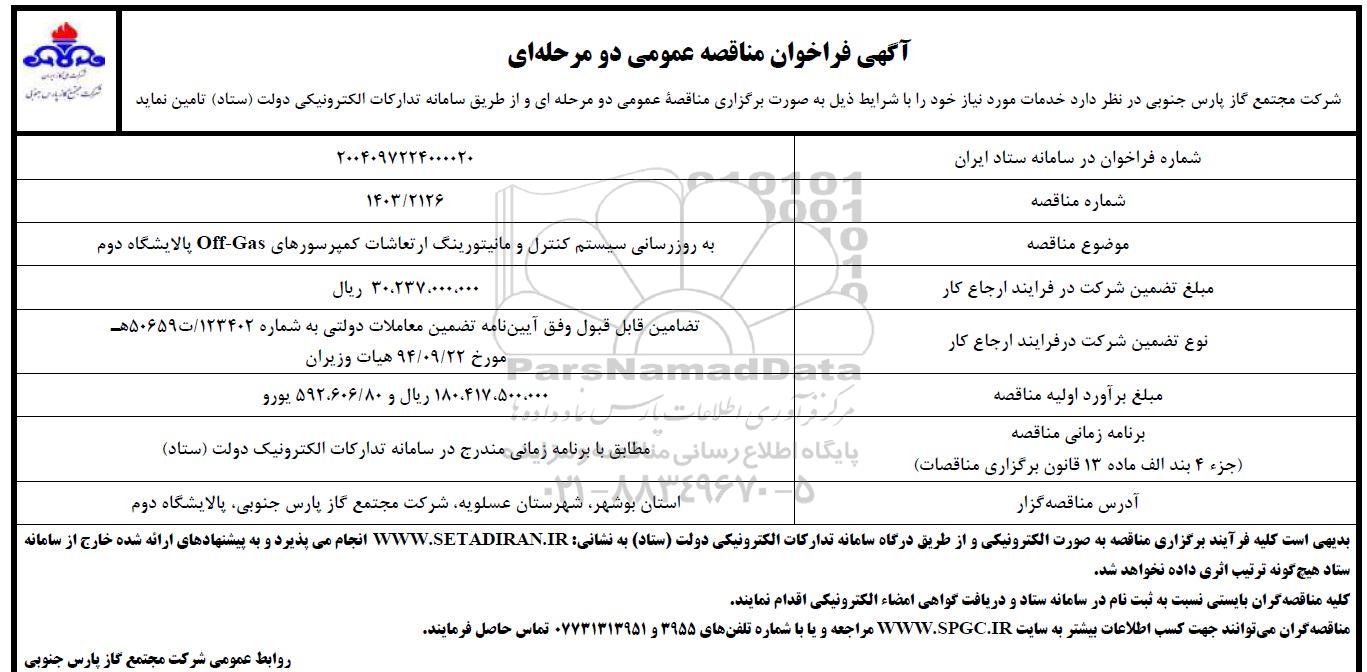 شرکت مجتمع گاز پارس جنوبی در نظر دارد اقلام مورد نیاز خود را با شرایط ذیل به صورت برگزاری مناقصه عمومی دو مرحله ای و از طریق سامانه تدارکات الکترونیکی دولت سامانه ستاد تامین نماید.