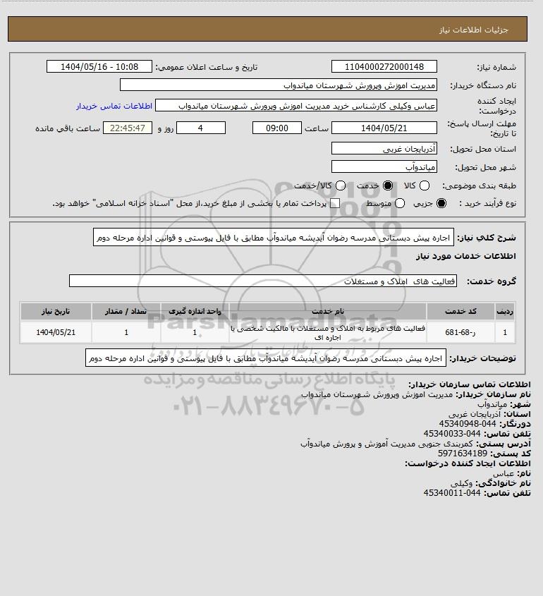 شرح کلی نیاز: اجاره پیش دبستانی مدرسه رضوان آیدیشه میاندوآب مطابق با فایل پیوستی و قوانین اداره مرحله دوم