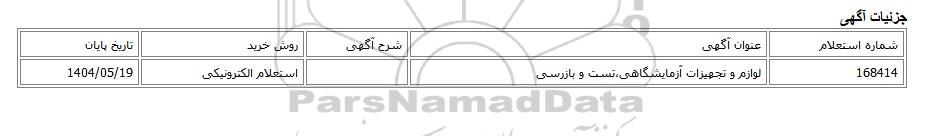| 168414 | لوازم و تجهیزات آزمایشگاهی،تست و بازرسی | استعلام الکترونیکی | 1404/05/19 |