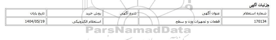 | 170134 | قطعات و تجهیزات وزن و سطح | استعلام الکترونیکی | 1404/05/19 |