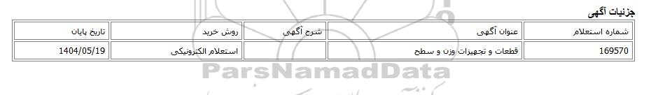 | 169570 | قطعات و تجهیزات وزن و سطح | استعلام الکترونیکی | 1404/05/19 |