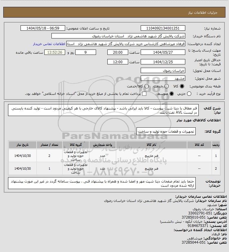 نام دستگاه خریدار:شرکت پالایش گاز شهید هاشمی نژاد استان خراسان رضوی