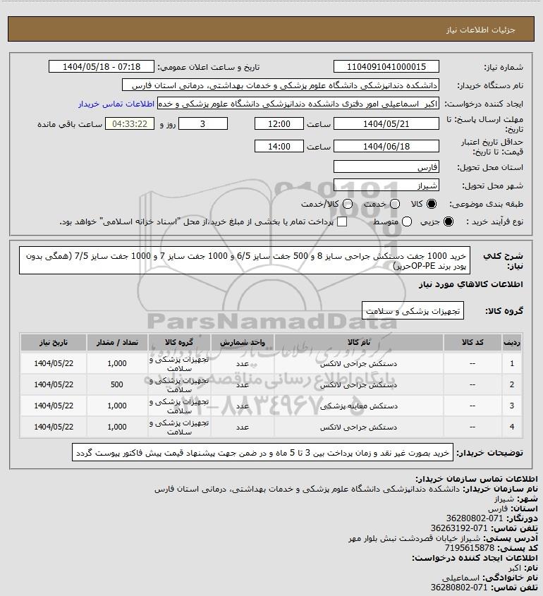 استعلام بها و موضوع استعلام استعلام خرید 1000 جفت دستکش جراحی سایز 8 و 500 جفت سایز 6/5 و 1000 جفت سایز 7 و 1000 جفت سایز 7/5 (همگی بدون پودر برند OP-PEحریر) به اطلاع کلیه شرکتها و افراد متخصص واجد شرایط میرساند، آگهی گذار در نظر دارد از طریق استعلام بها، نسبت به انتخاب و دریافت پیشنهادات اقدام نماید. این استعلام با کد آگهی ثبت شده در سامانه خبرگزاری پارس نماد : 9379051 منتشر شده است. مشخصات استعلام : تاریخ شروع استعلام: 1404/05/18 آخرین مهلت ارسال پیشنهاد قیمت : 1404/05/21 و محل اجرای پروژه : استان فارس میباشد. استعلام قیمت مورد درخواست : استعلام خرید 1000 جفت دستکش جراحی سایز 8 و 500 جفت سایز 6/5 و 1000 جفت سایز 7 و 1000 جفت سایز 7/5 (همگی بدون پودر برند OP-PEحریر) با دستهبندیهای تخصصی و گروه های مرتبط : خدمات و تجهیزات آزمایشگاهی و پزشکی, استعلام اطلاع رسانی میگردد. شرایط شرکت در استعلام آنلاین : ابتدا ثبت نام در سامانه استعلام پارس نماد و تکمیل مدارک موردنیاز و بارگذاری در سامانه رعایت تمامی ضوابط و الزامات مندرج در اسناد استعلام است.