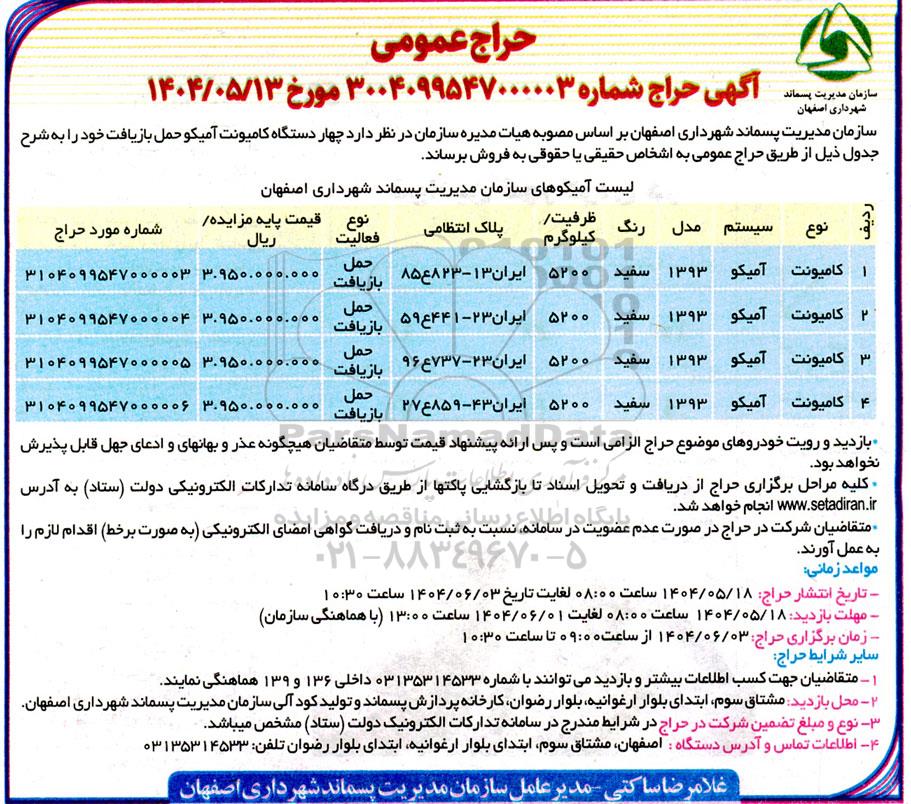 مزایده عمومی حراج عمومی فروش چهار دستگاه کامیونت آمیکو حمل بازیافت برگزار میگردد. از کلیه افراد متخصص و شرکت‌های واجد شرایط دعوت به عمل می‌آید تا در این مزایده با کد خبرگزاری پارس نماد : 9379870 شرکت نمایند تاریخ شروع مزایده : 1404/05/18 مهلت شرکت در مزایده: تا پایان روز 1404/06/03 مکان برگزاری اموال واگذاری استان‌های اصفهان و دسته‌بندی‌های مربوط به این حراجی ماشین آلات سنگین و نیمه سنگین میباشد.