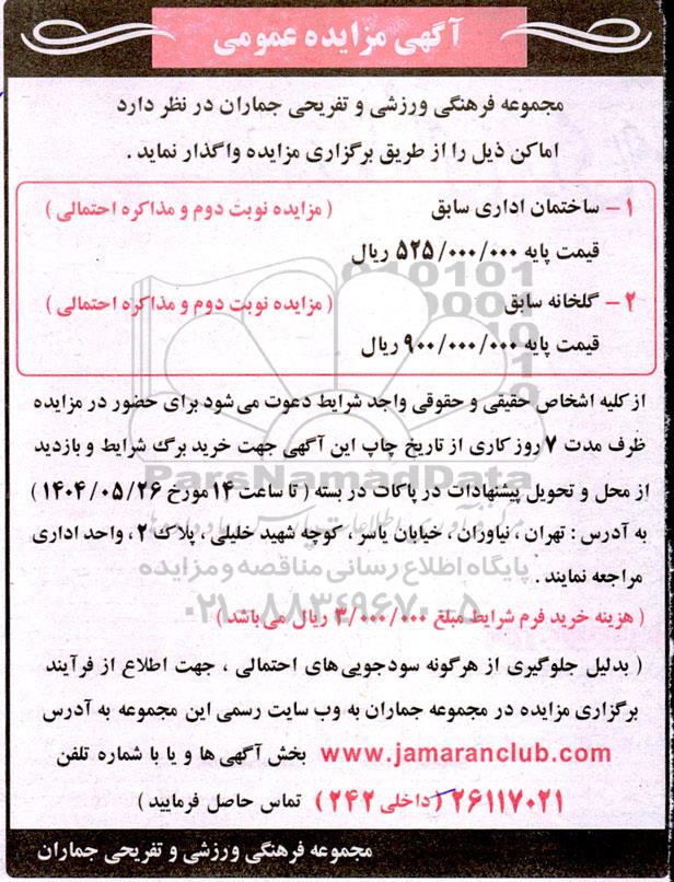 مجموعه فرهنگی ورزشی و تفریحی جماران در نظر دارد اماکن ذیل را از طریق برگزاری مزایده واگذار نماید.