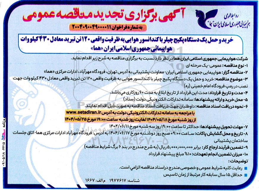 به شماره فراخوان 2004090049000011 خرید و حمل یک دستگاه پکیج چیلر با کندانسور هوایی به ظرفیت واقعی 120 تن تبرید معادل 430 کیلووات هواپیمائی جمهوری اسلامی ایران «هما»