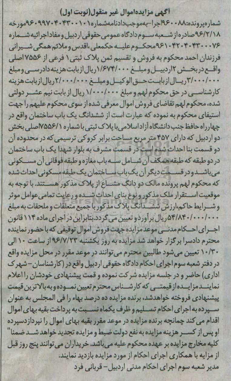 مزایده پلاک ثبتی یک فرعی بخش دو اردبیل کلاسه 960088 غیرمنقول