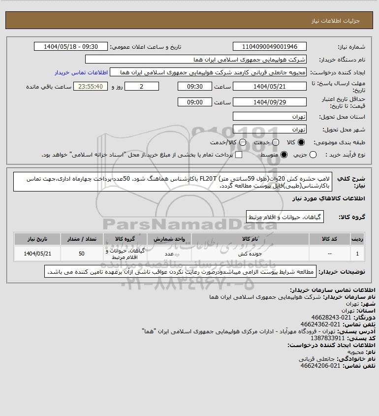 شرح کلی نیاز: لامپ حشره کش 20وات(طول 59سانتی متر) FL20T باکارشناس هماهنگ شود. 50عدد-پرداخت چهارماه اداری،جهت تماس باکارشناس(طیبی)فایل پیوست مطالعه گردد.