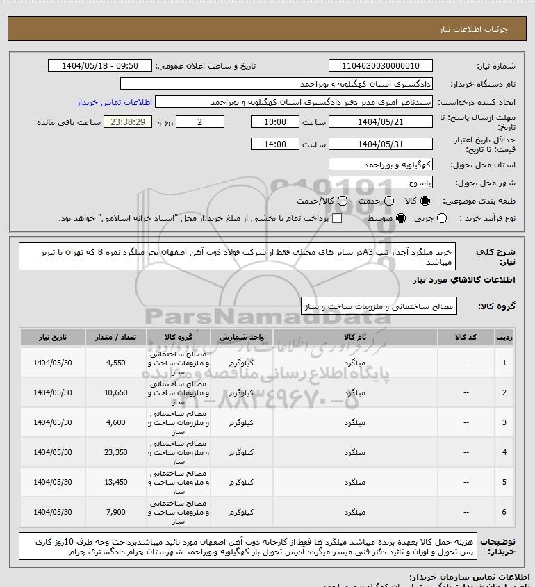 | 2 | -- | میلگرد | کیلوگرم | مصالح ساختمانی و ملزومات ساخت و ساز | 10,650 | 1404/05/30 |