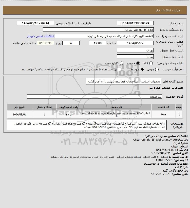 شرح کلی نیاز: تعمیرات اساسی ساختمان فرماندهی پلیس راه آهن کشور