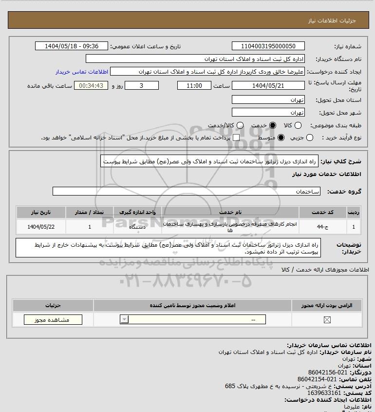 شرح کلی نیاز: راه اندازی دیزل ژنراتور ساختمان ثبت اسناد و املاک ولی عصر(عج) مطابق شرایط پیوست