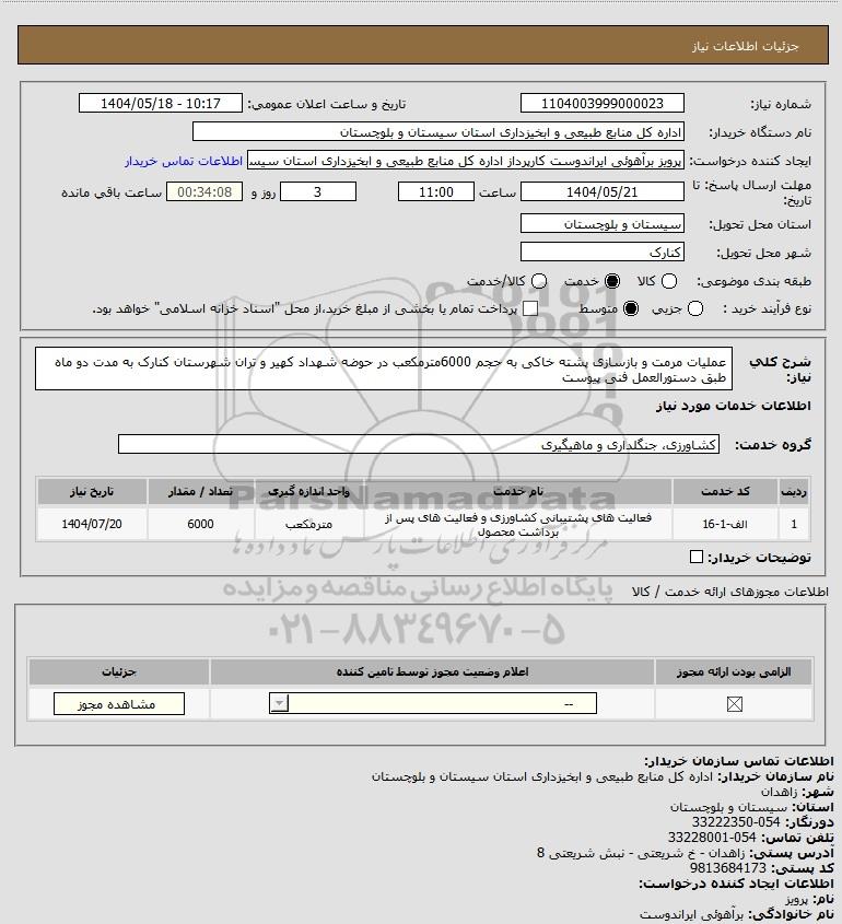 شرح کلی نیاز: عملیات مرمت و بازسازی پشته خاکی به حجم 6000مترمکعب در حوضه شهداد کهیر و تران شهرستان کنارک به مدت دو ماه طبق دستورالعمل فنی پیوست