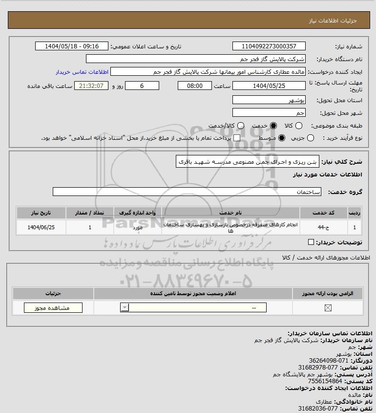 شرح کلی نیاز: بتـن ریـزی و اجـرای چمـن مصنوعی مدرسـه شهیـد باقری