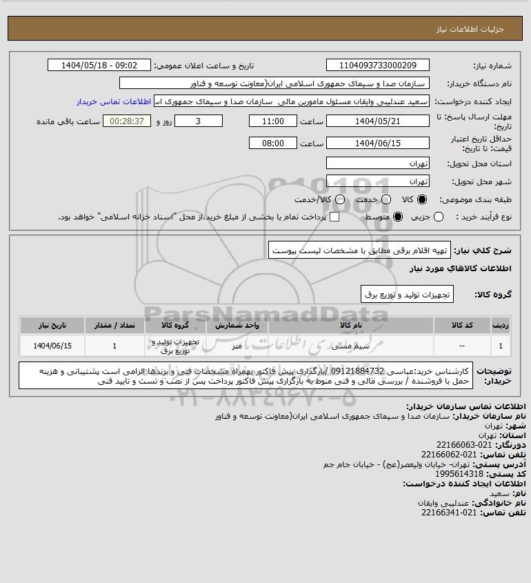 استعلام تهیه اقلام برقی مطابق با مشخصات لیست پیوست, استعلام تهیه اقلام برقی مطابق با مشخصات لیست پیوست