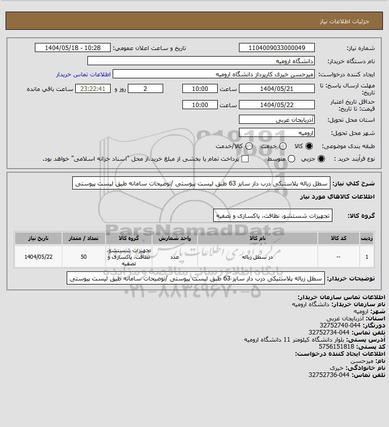 | 1 | -- | در سطل زباله | عدد | تجهیزات شستشو، نظافت، پاکسازی و تصفیه | 50 | 1404/05/22 |