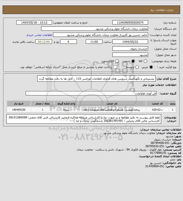 شرح کلی نیاز: پشتیبانی و نگهداشت سرویس های فناوری اطلاعات اورژانس 115 _ فایل ها به دقت مطالعه گردد