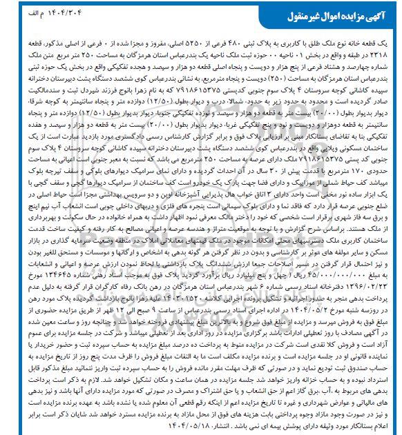 مزایده فروش ملک به پلاک ثبتی 480 فرعی از 5250 اصلی