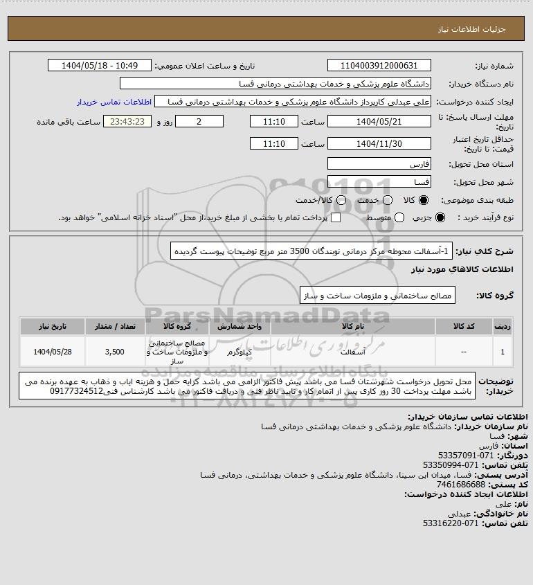 شرح کلی نیاز: 1-آسفالت محوطه مرکز درمانی نوبندگان 3500 متر مربع