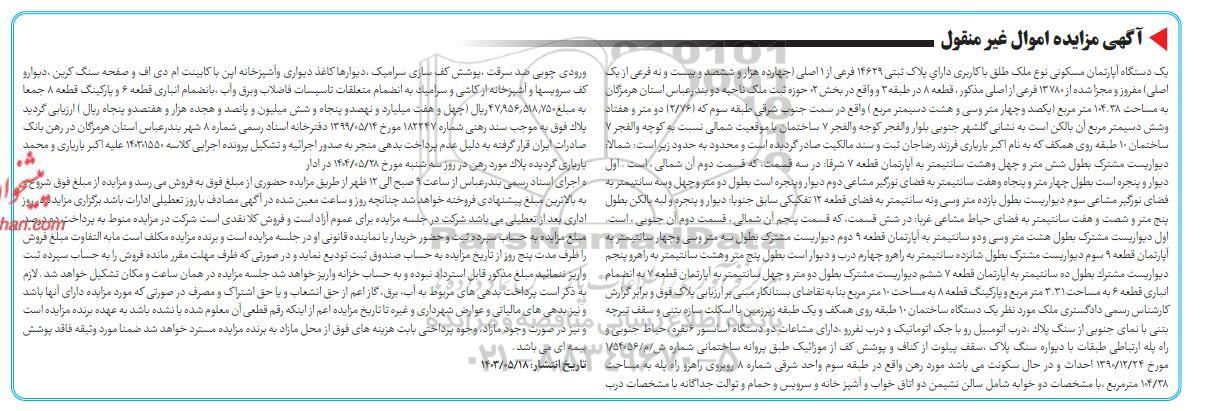 مزایده فروش یکدستگاه آپارتمان مسکونی به پلاک ثبتی 14629 فرعی از 1 اصلی به مبلغ 47.956.518.750 ریال