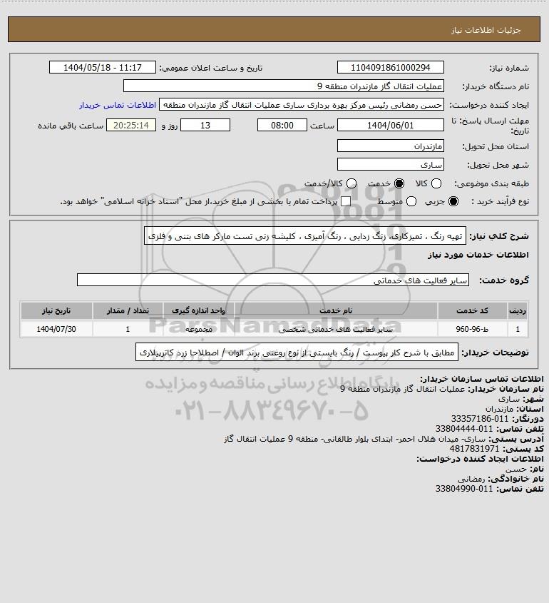 شرح کلی نیاز: تهیه رنگ ، تمیزکاری، زنگ زدایی ، رنگ آمیزی ، کلیشه زنی تست مارکر های بتنی و فلزی