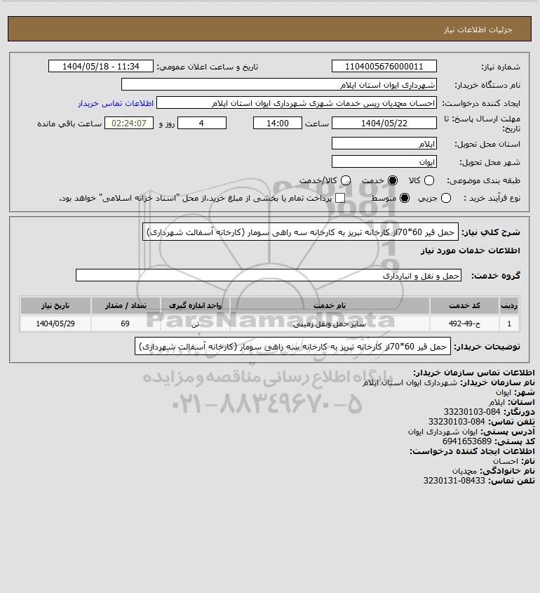 توضیحات خریدار:حمل قیر 60*70از کارخانه تبریز به کارخانه سه راهی سومار (کارخانه آسفالت شهرداری)