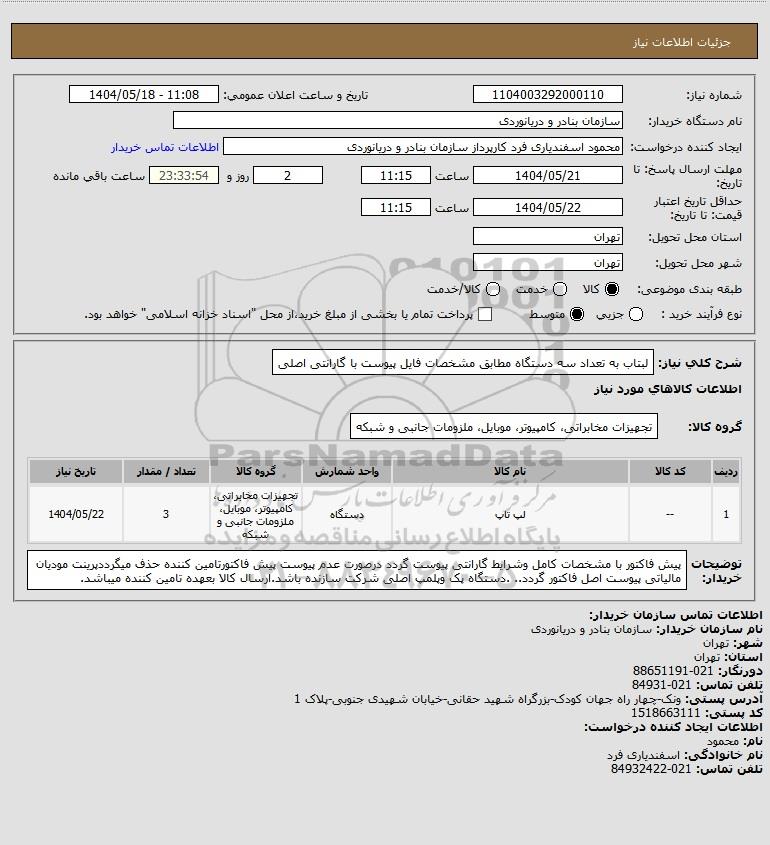 استعلام لبتاب به تعداد سه دستگاه مطابق مشخصات فایل پیوست با گارانتی اصلی, استعلام لبتاب به تعداد سه دستگاه مطابق مشخصات فایل پیوست با گارانتی اصلی