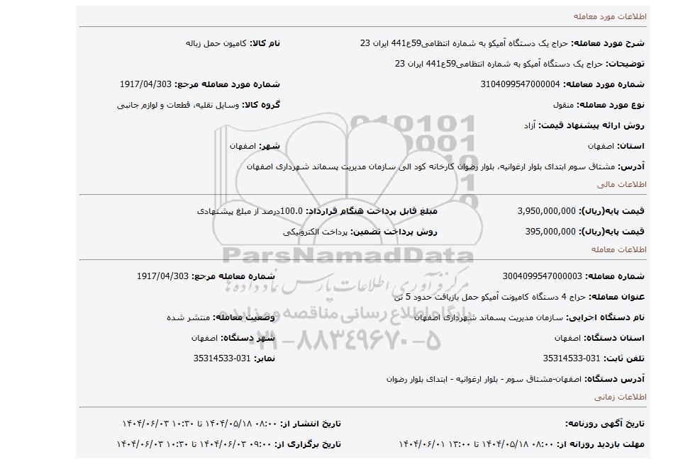 | عنوان معامله: حراج 4 دستگاه کامیونت آمیکو حمل بازیافت حدود 5 تن | ||