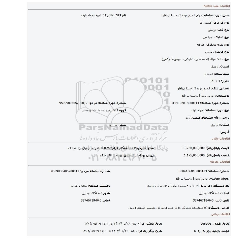 مزایده عمومی مزایده ایوریق یری 3 روستا تپراقلو برگزار میگردد. از کلیه افراد متخصص و شرکت‌های واجد شرایط دعوت به عمل می‌آید تا در این مزایده با کد خبرگزاری پارس نماد : 9381960 شرکت نمایند تاریخ شروع مزایده : 1404/05/18 مهلت شرکت در مزایده: تا پایان روز 1404/05/29 مکان برگزاری اموال واگذاری استان‌های اردبیل و دسته‌بندی‌های مربوط به این حراجی ماشین آلات و تجهیزات کشاورزی و دام پروری, املاک و زمین میباشد. اطلاعات دقیق‌تر درباره شرایط شرکت در مزایده آنلاین و نحوه ارسال مدارک، الزامات پروژه و دریافت اسناد مزایده و تاریخ بازگشایی پاکت‌ها، در بخش اطلاعات تکمیلی این آگهی درج شده است.