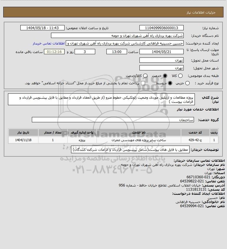 شرح کلی نیاز: پروژه مطالعات و ارزیابی موردی وضعیت ژئوتکنیکی خطوط مترو (از طریق انعقاد قرارداد و مطابق با فایل پیشنویس قرارداد و الزامات پیوست )