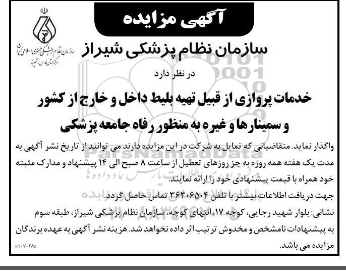 سازمان نظام پزشکی شیراز در نظر دارد خدمات پروازی از قبیل تهیه بلیط داخل و خارج از کشور و سمینارها و غیره به منظور رفاه جامعه پزشکی