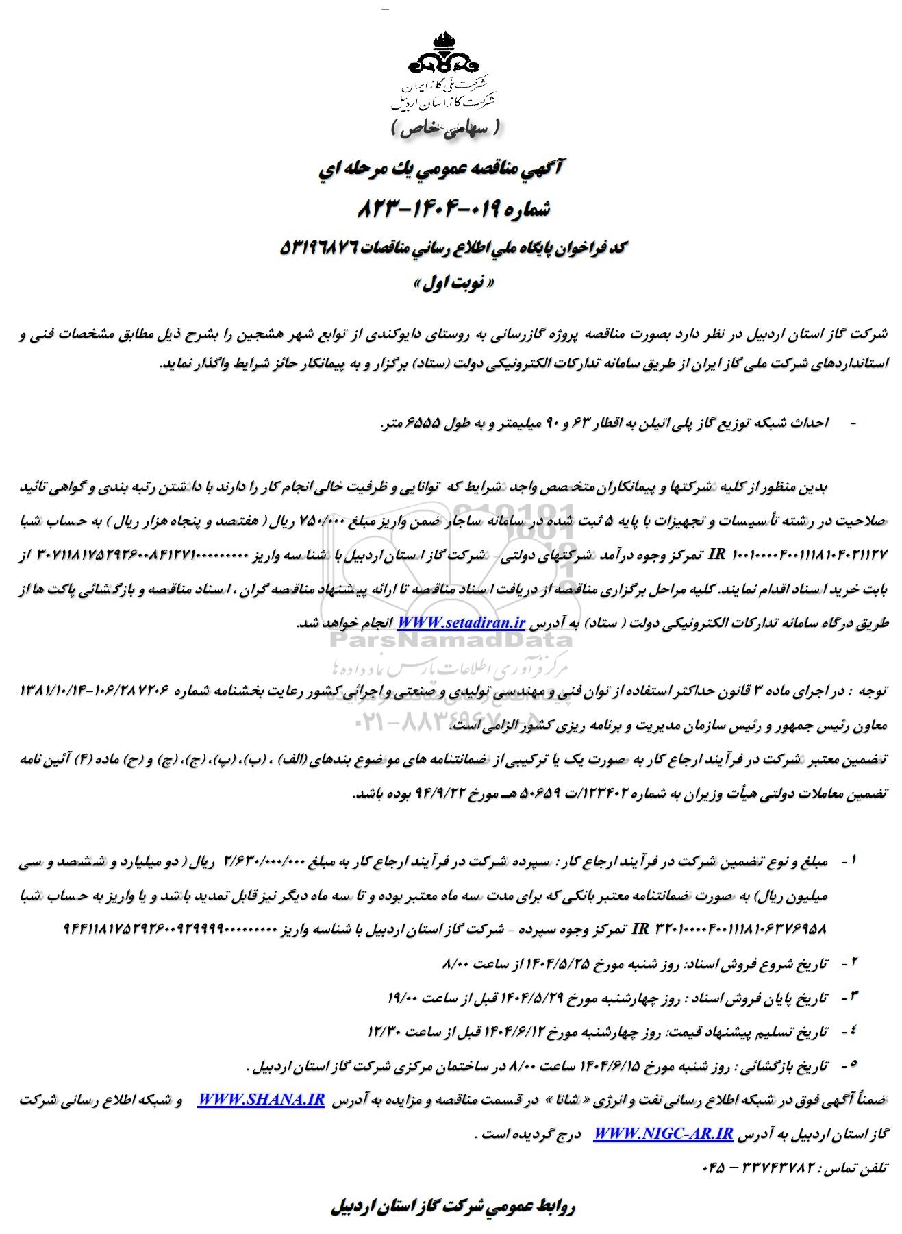 ضمناً آگهی فوق در شبکه اطلاع رسانی نفت و انرژی شانا» در قسمت مناقصه و مزایده به آدرس WWW.SHANA.IR و شبکه اطلاع رسانی شرکت گاز استان اردبیل به آدرس WWW.NIGC-AR.IR درج گردیده است .