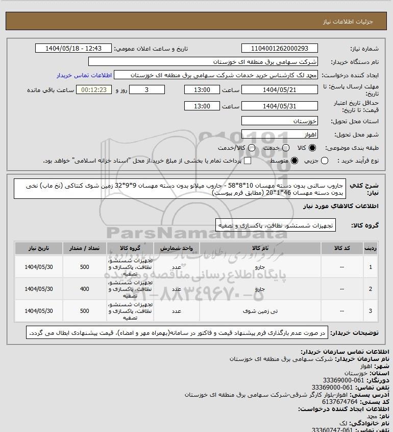 نام سازمان خریدار: شرکت سهامی برق منطقه ای خوزستان