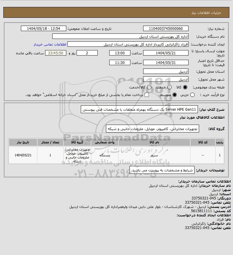 شرح کلی نیاز: Server HPE Gen11 یک دستگاه بهمراه متعلقات با مشخصات فنی پیوستی