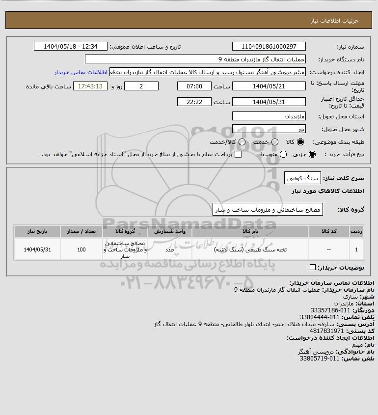 | 1 | -- | تخته سنگ طبیعی (سنگ لاشه) | عدد | مصالح ساختمانی و ملزومات ساخت و ساز | 100 | 1404/05/31 |