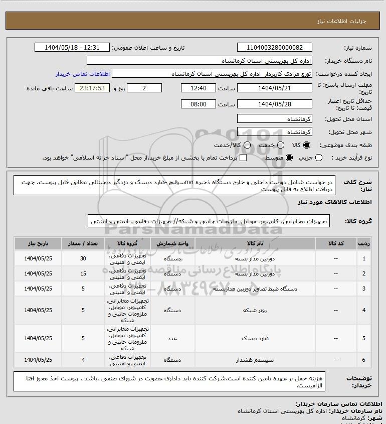 شرح کلی نیاز: در خواست شامل دوربیت داخلی و خارج دستگاه ذخیره nvrسوئیچ -هارد دیسک و دزدگیر دیجیتالی مطابق فایل پیوست. جهت دریافت اطلاع به فایل پیوست