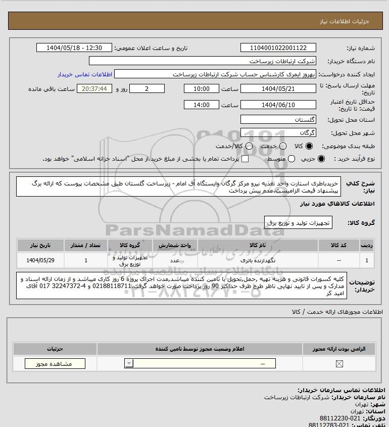 شرح کلی نیاز: خریدباطری استارت واحد تغذیه نیرو مرکز گرگان وایستگاه آق امام - زیرساخت گلستان طبق مشخصات پیوست که ارائه برگ پیشنهاد قیمت الزامیست.عدم پیش پرداخت