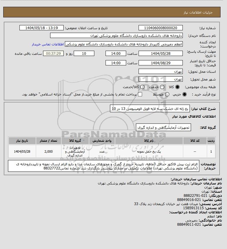 | 1 | -- | پک یخ حمل نمونه | عدد | تجهیزات آزمایشگاهی و اندازه گیری | 2,000 | 1404/05/28 |