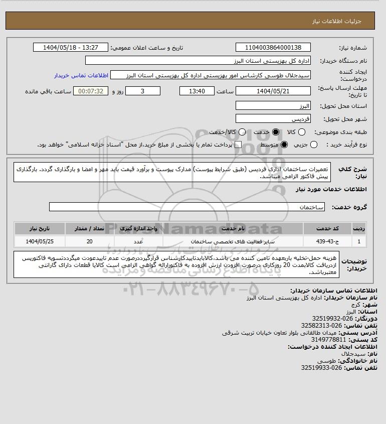 شرح کلی نیاز: تعمیرات ساختمان اداری فردیس (طبق شرایط پیوست) مدارک پیوست و برآورد قیمت باید مهر و امضا و بارگذاری گردد. بارگذاری پیش فاکتور الزامی میباشد.