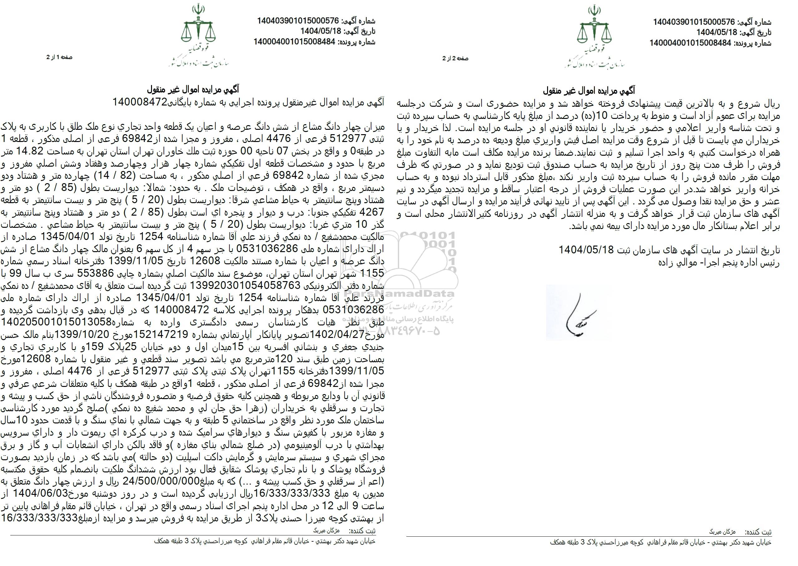 مزایده چهار دانگ به پلاک ثبتی 512977 فرعی از 4476 اصلی به مساحت 14.82 متر مربع